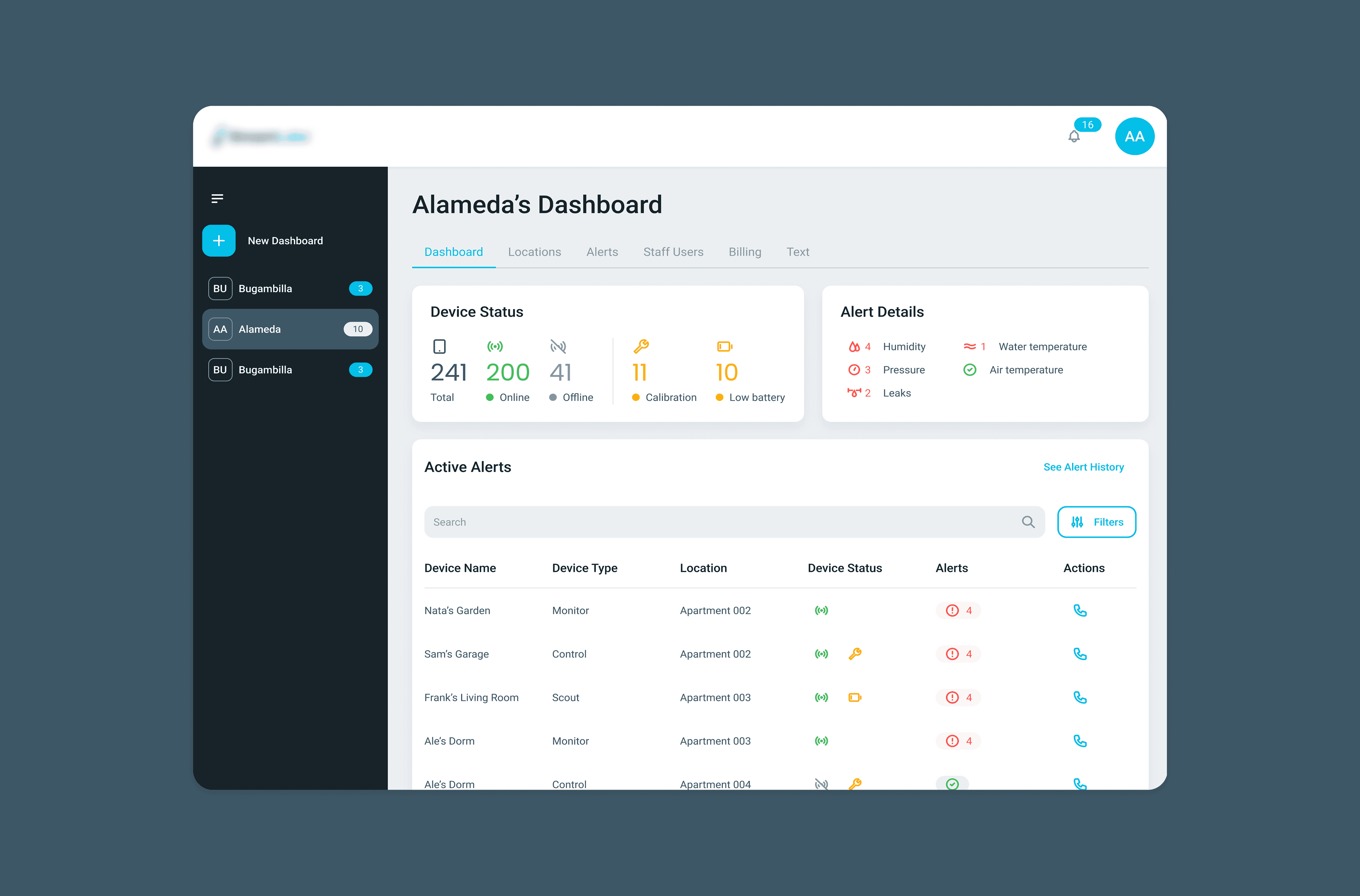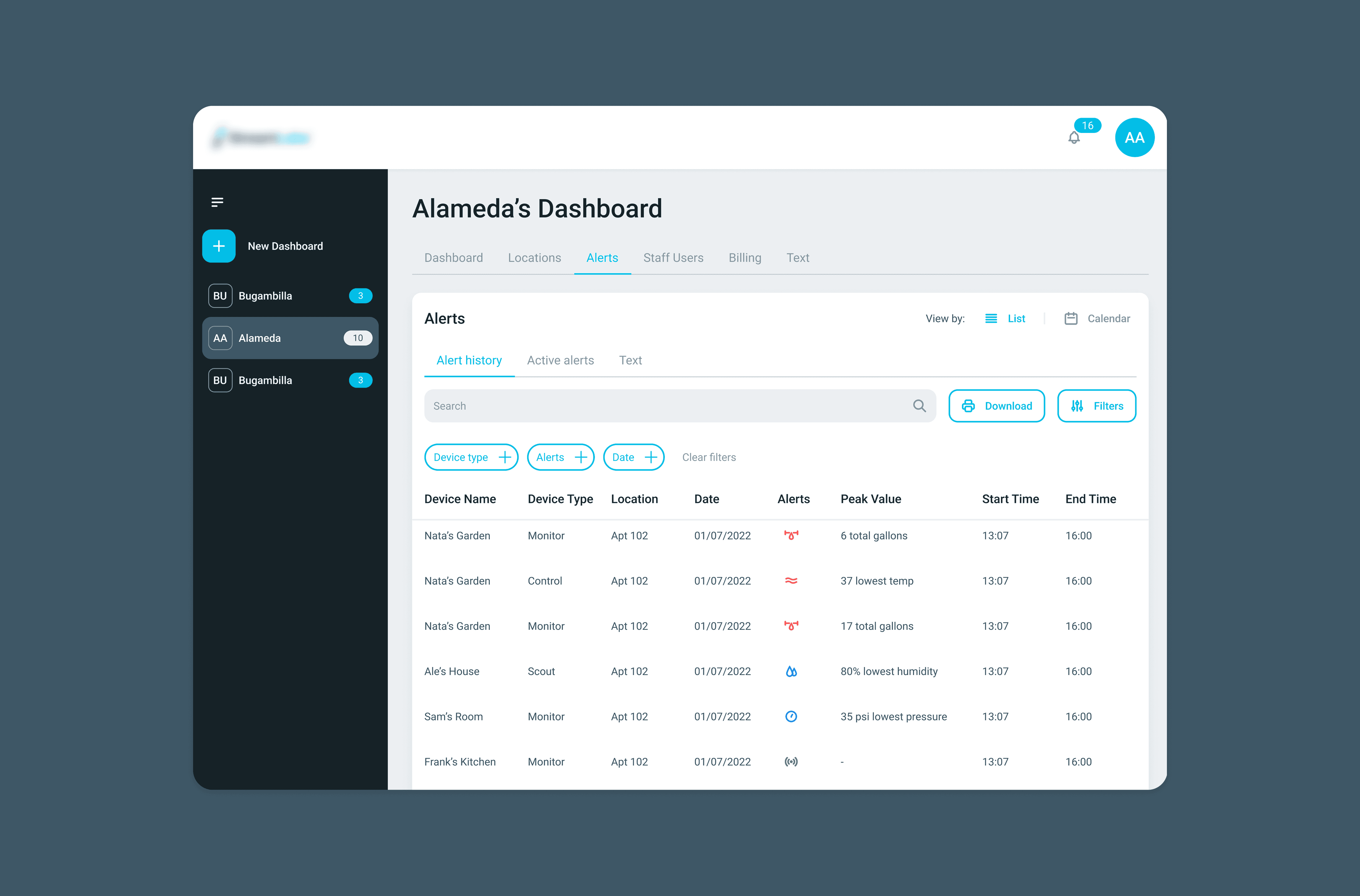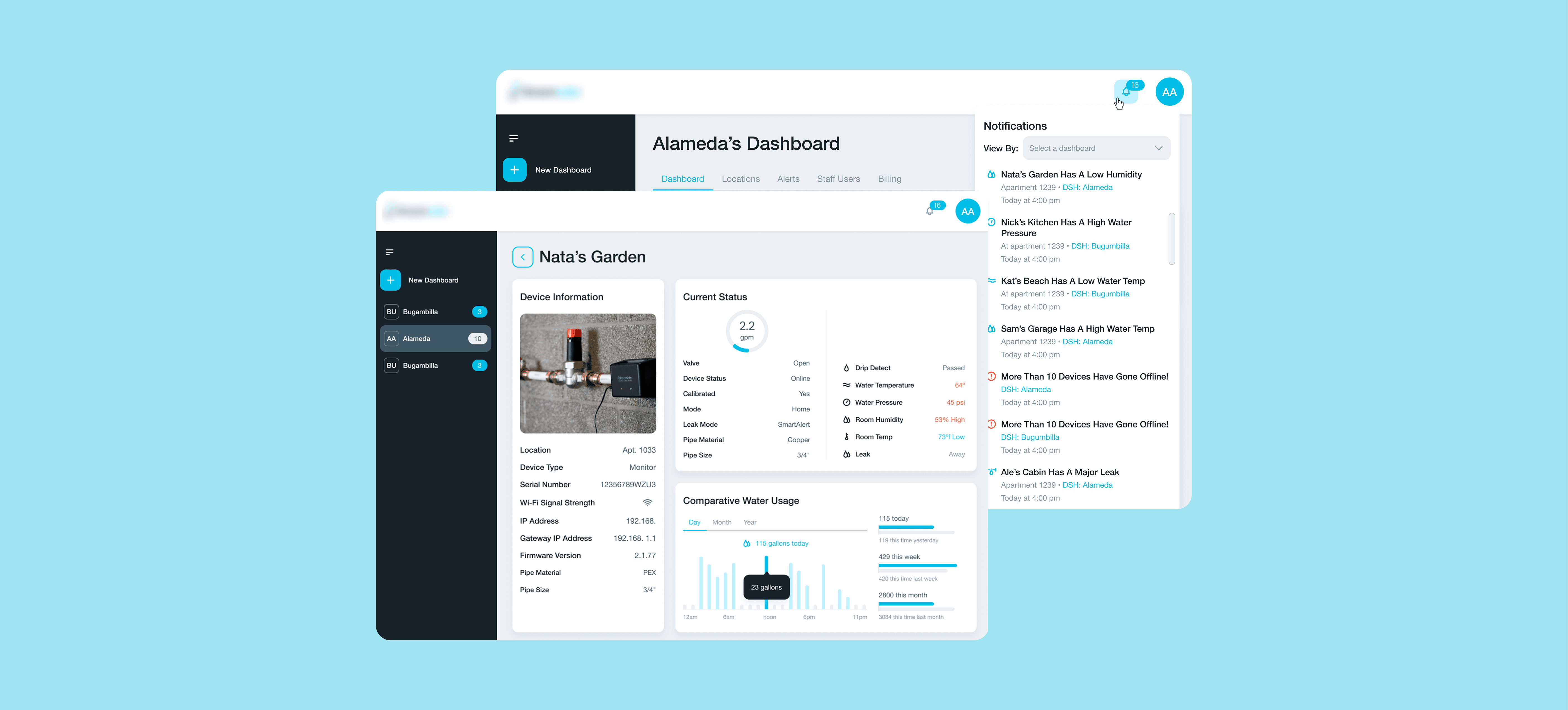 Facilitated leak data sharing between device owners and property owners, while enabling managers to monitor multiple locations from a single platform.